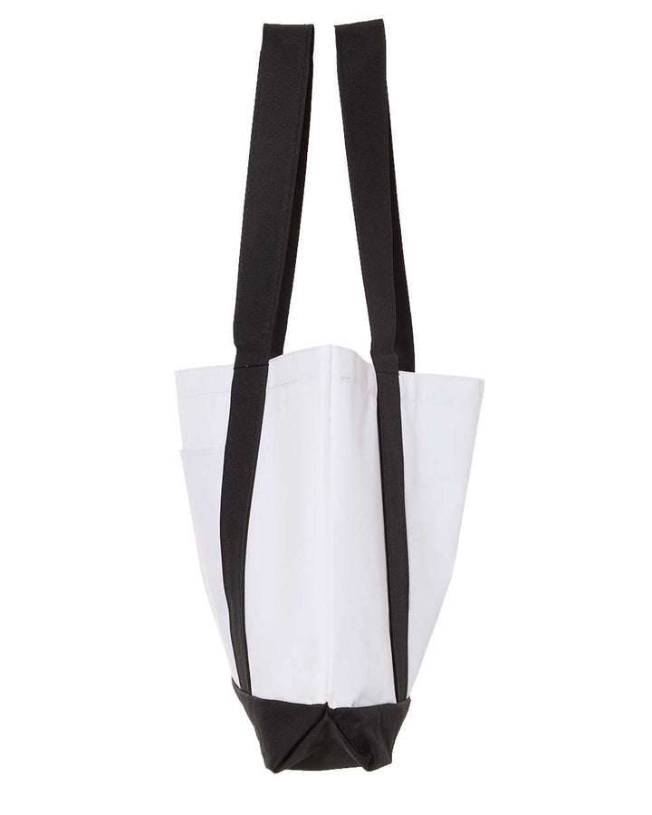 DESCRIPTION: This is a Shopping Bag, 18.5"W x 12"H with 3.5" depth. 100% Polyester. White bag with black handle and bottom, with open front pocket. Comes in color or black design.