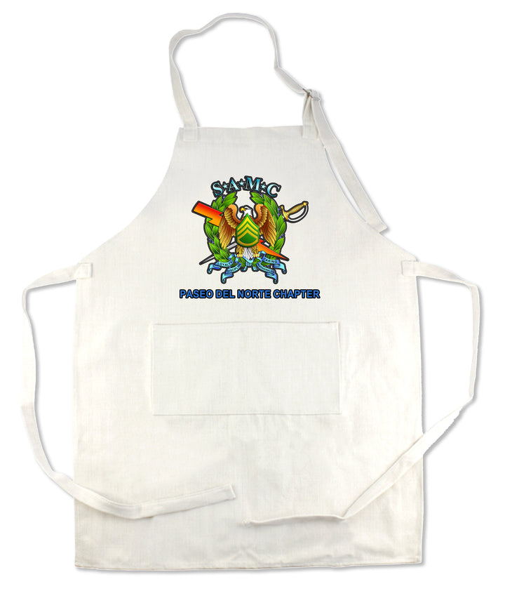 DESCRIPTION: This is a 33" x 25" Apron – with large front pocket and stainless-steel strap holder. 100% Polyester. Natural colored faux burlap polyester sublilinen.